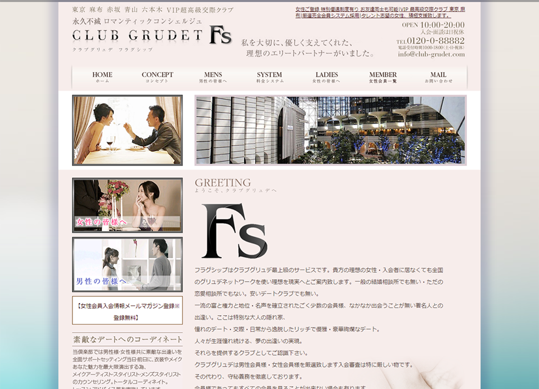 このクラブの特徴東京と関西方面に強い交際クラブ。元モデルやタレントなどの、芸能関係の女性が多い。また出逢いたい人とセッティングしてくれるフラグシップオーナー会員は、入会金と年会費が200万、セッティング100万と超高級プランがある。